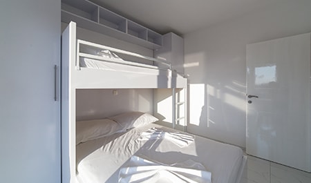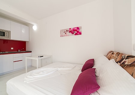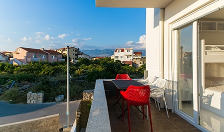Apartman je veličin 40m2 + balkon. Apartman sadrži dnevnu sobu (TV) u kojoj na kauču na razvlačenje može spavati 2 osobe, dnevna soba spojena je s kuhinjom, opremljenom potrebnom opremom(mikrovalna pećnica), 1 spavaću sobu s krevetom na kat za 3 osobe, kupaonicu (tuš, wc) i balkon. Apartman također ima besplatan parking, sef te wifi.