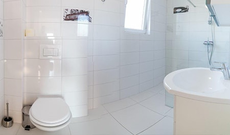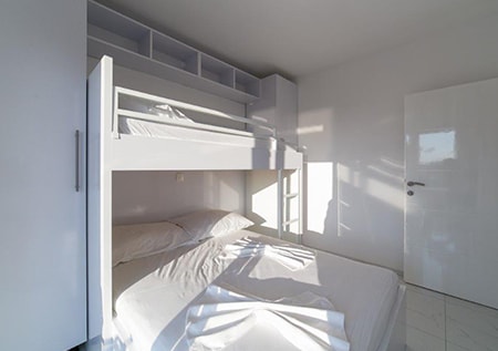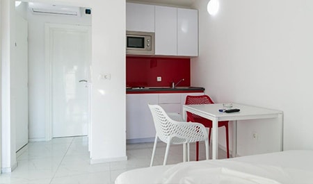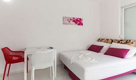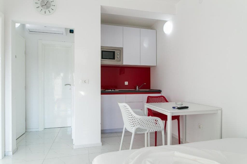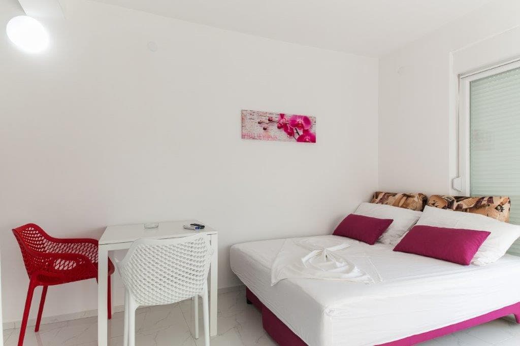 Apartment of 40m2 + yard. It also includes a living room(TV) with an expandable couch which can serve as a bed for 2 persons, a kitchen which is connected to the living room and is completely furnished(oven), 1 bedroom with a bunk bed for 3 persons ,a bathroom (shower, toilet), yard and solar shower. The apartment also has free parking, a safe and a wifi.