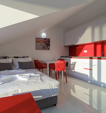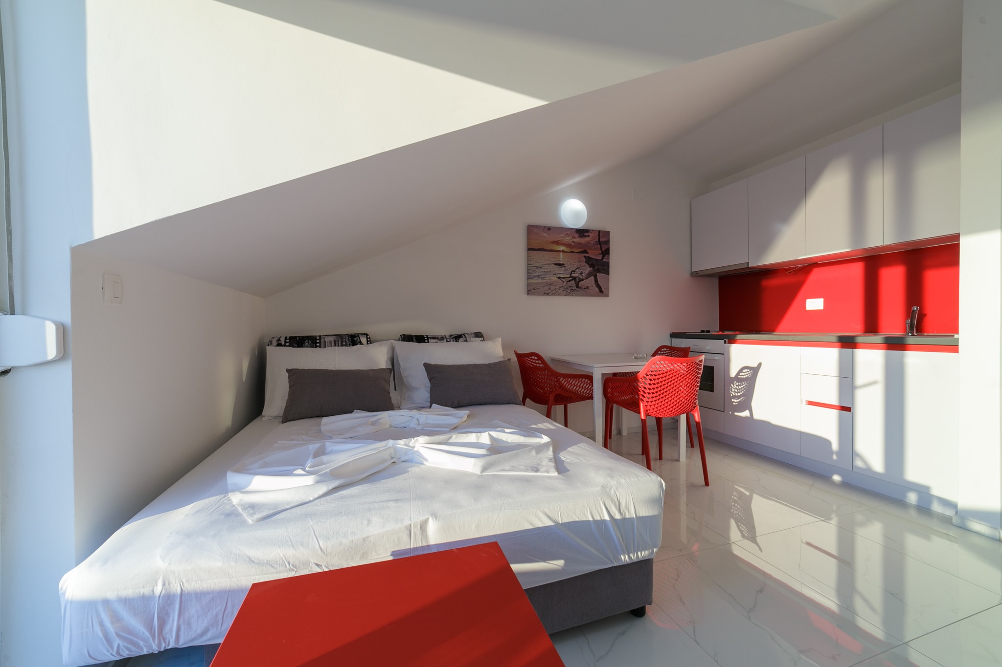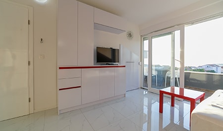 Apartment of 40m2 + balcony. It also includes a living room(TV) with an expandable couch which can serve as a bed for 2 persons, a kitchen which is connected to the living room and is completely furnished(oven), 1 bedroom with a large French bed for 3 people, a bathroom (shower, toilet) and balcony. The apartment also has free parking, a safe and a wifi.