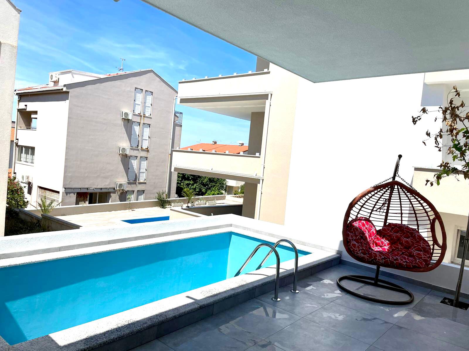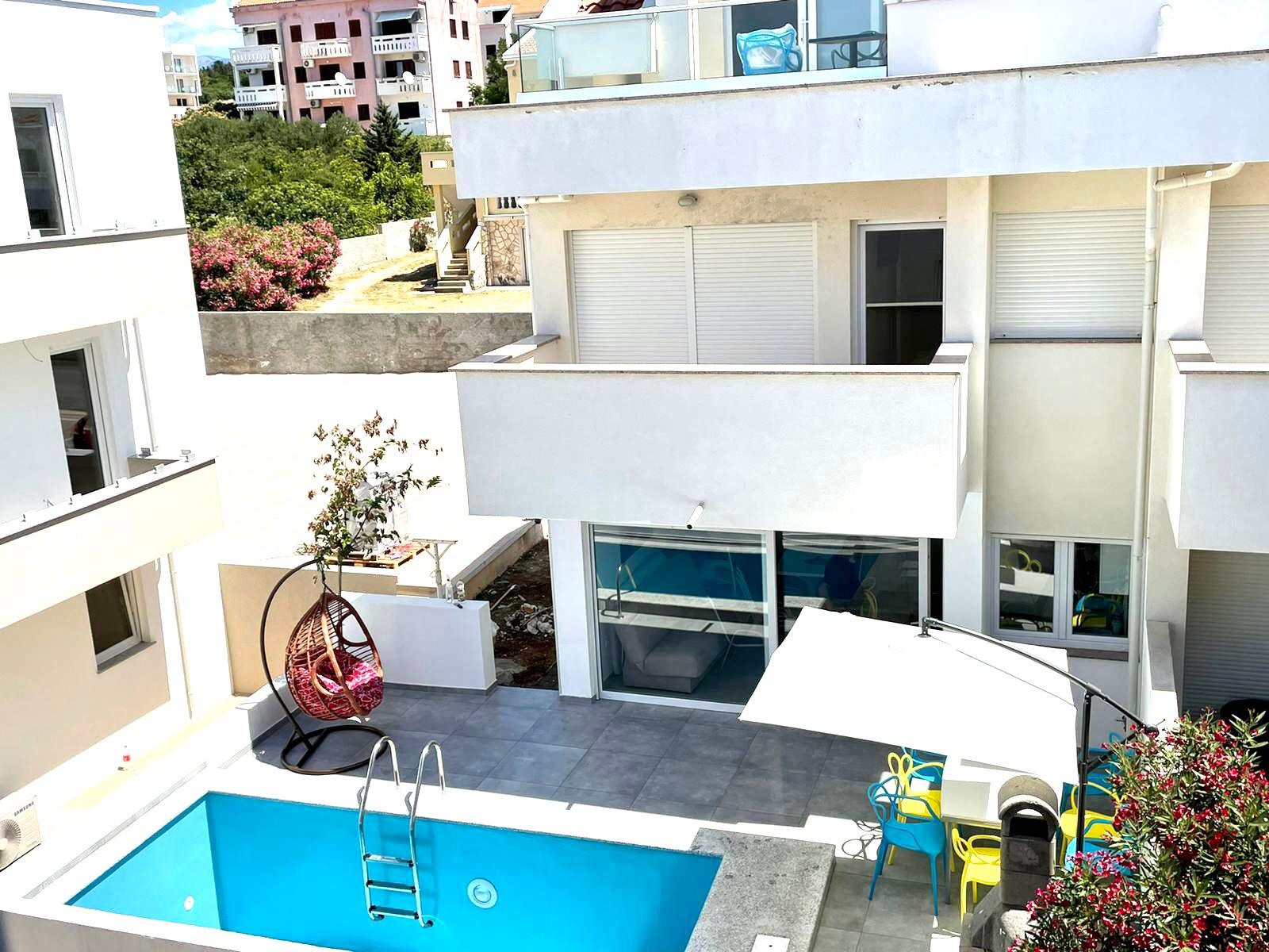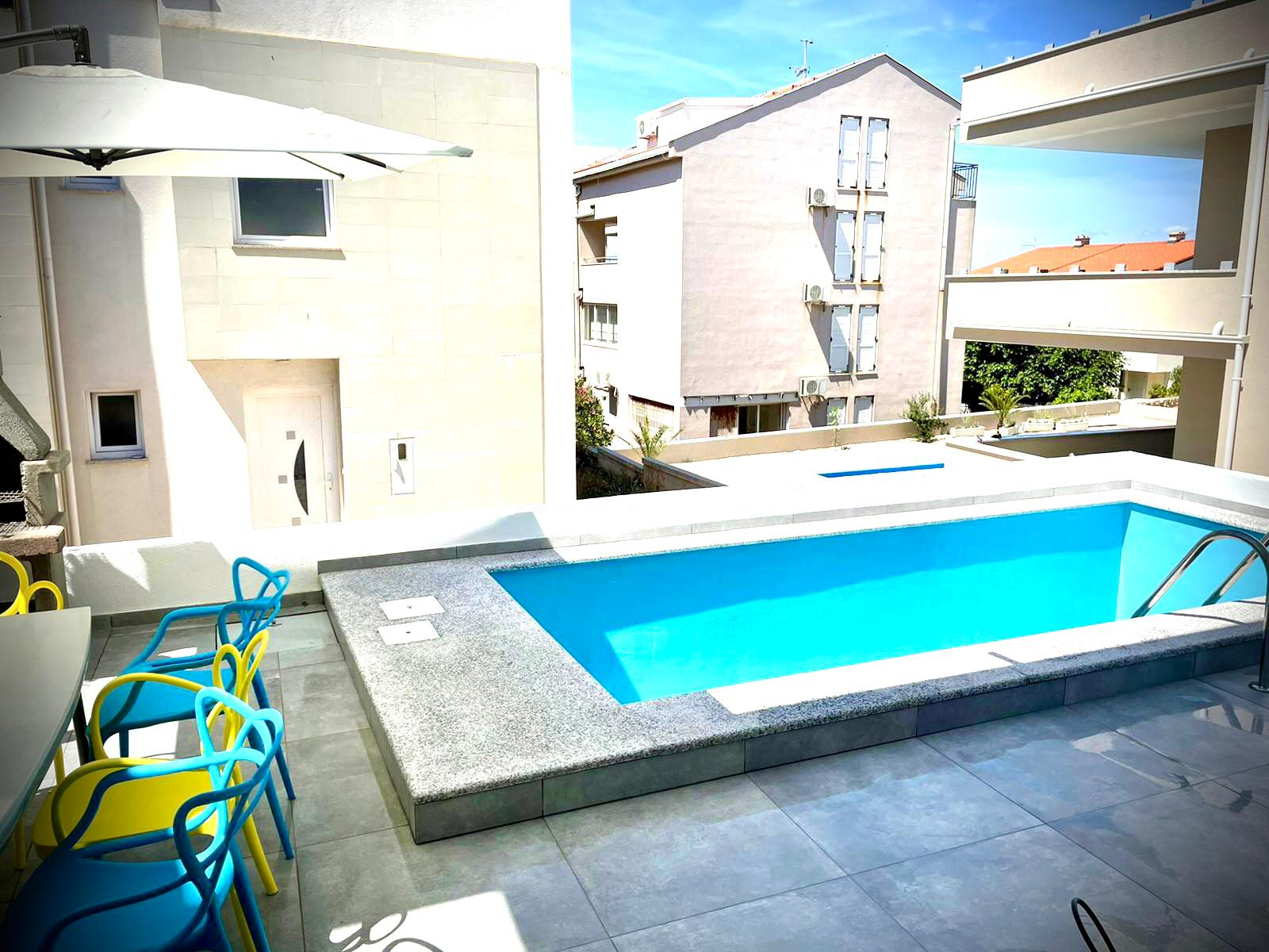 The Apartment's size is cca 110 m2, Ground floor: living room with kitchen,TV, Terrace with Privatpool and barbecue, bathroom (shower, toilet);and a Sofabed(2Person), 1st Floor: 2 bedrooms - for 4 persons, one more bathroom (shower, toilet); Upstairs on the top: 2 Bedrooms for 4 persons, of the house there is a small terace with nice sea view