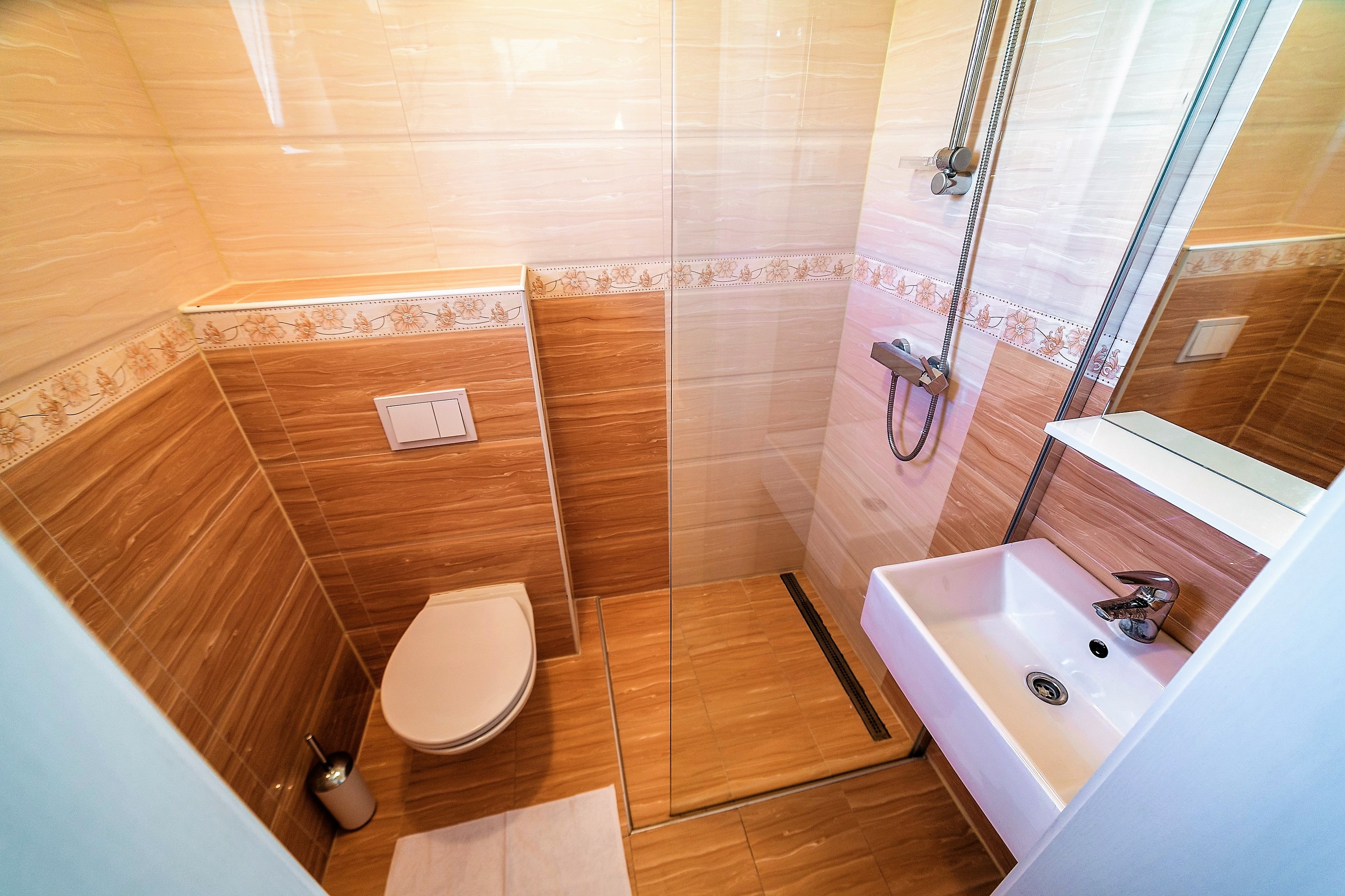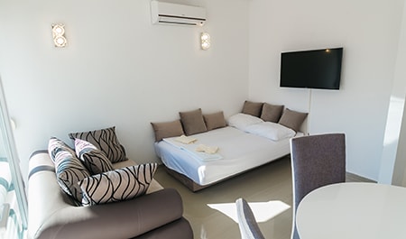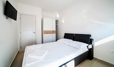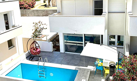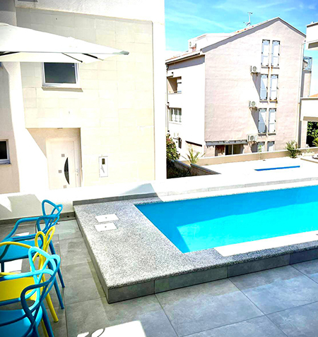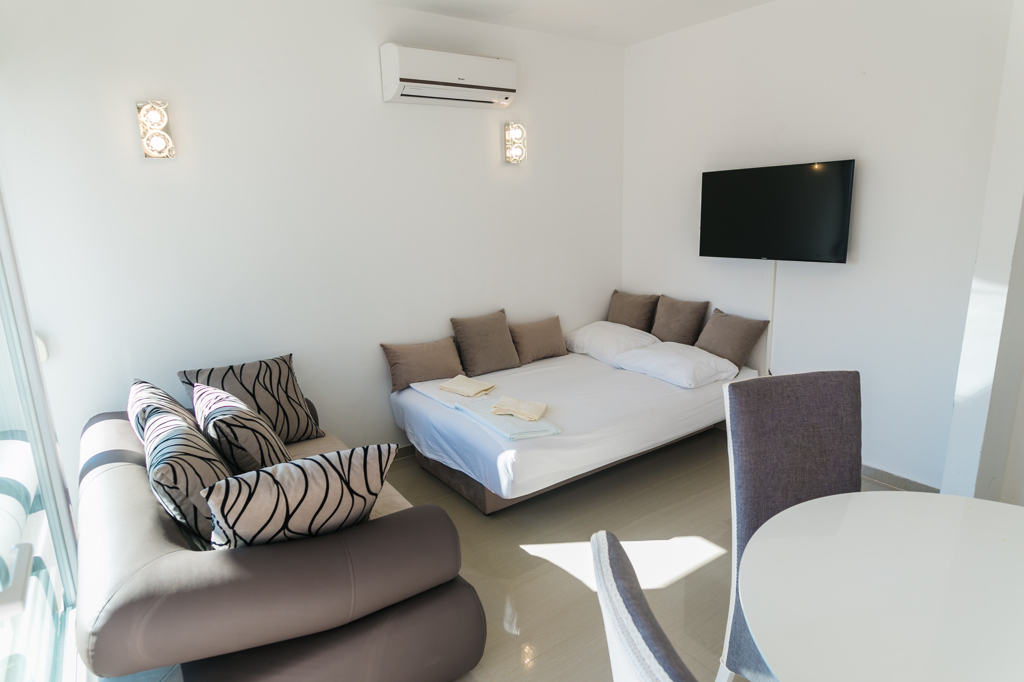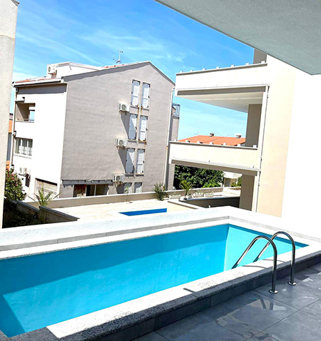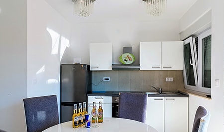 The Apartment's size is cca 110 m2, Ground floor: living room with kitchen,TV, Terrace with Privatpool and barbecue, bathroom (shower, toilet);and a Sofabed(2Person), 1st Floor: 2 bedrooms - for 4 persons, one more bathroom (shower, toilet); Upstairs on the top: 2 Bedrooms for 4 persons, of the house there is a small terace with nice sea view