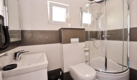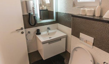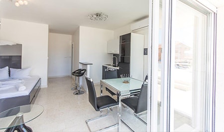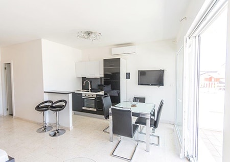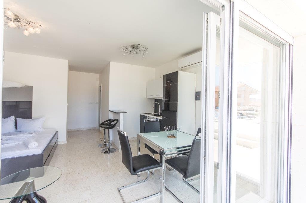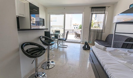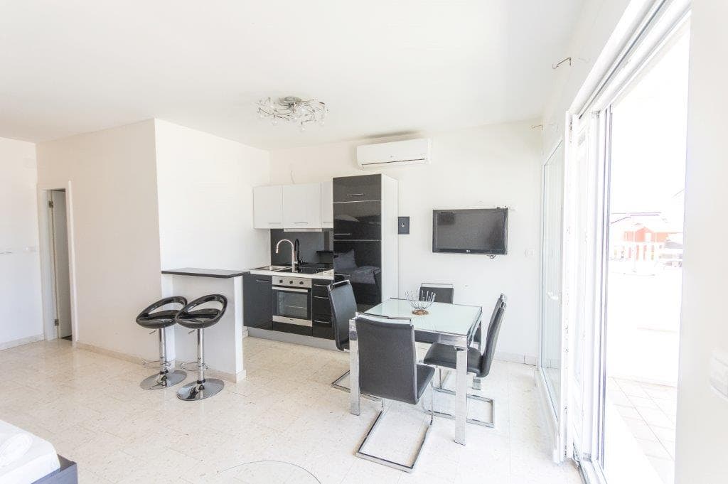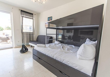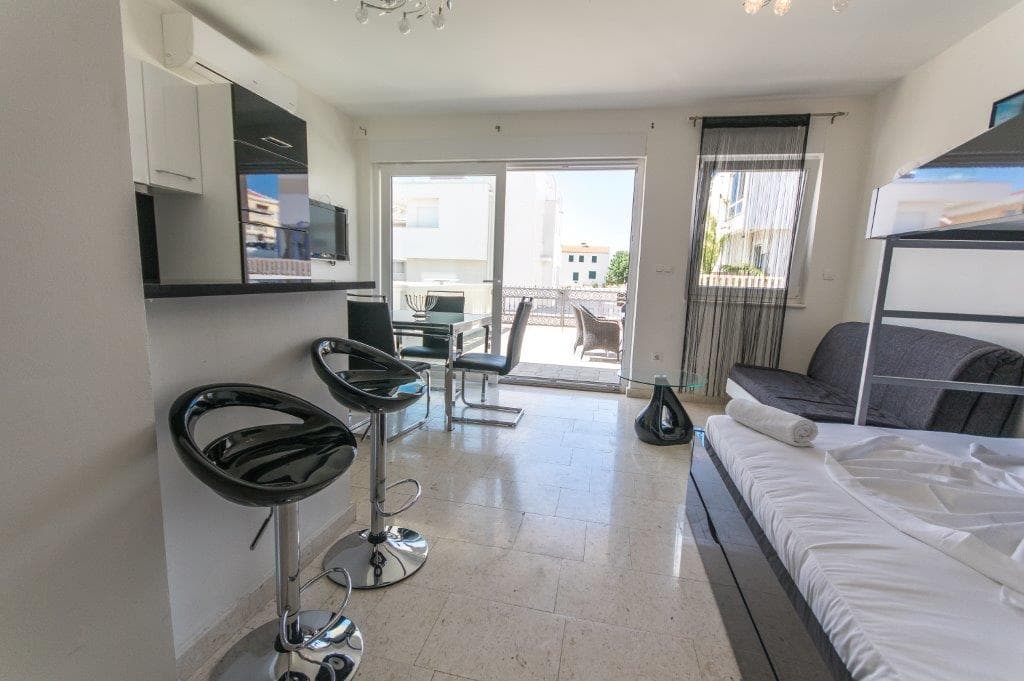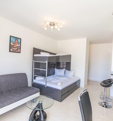 Apartment has one room which stands as a living room plus a kitchen. There is a bunk bed for 3 persons and an extendable couch which can also serve as a bed for 2 persons.