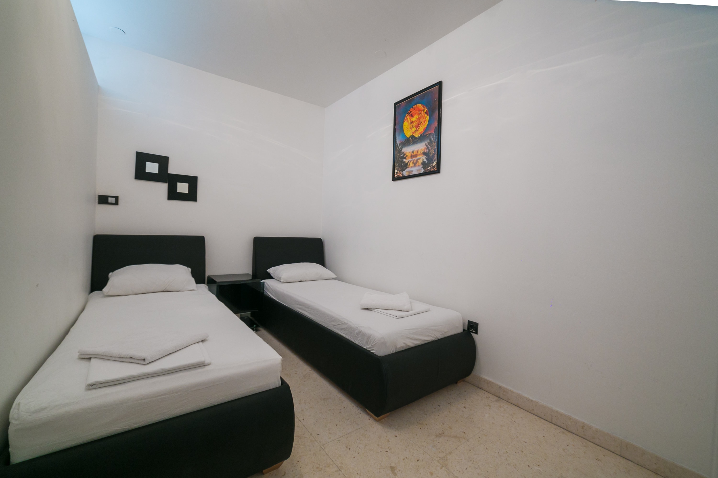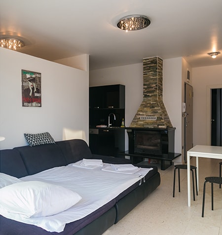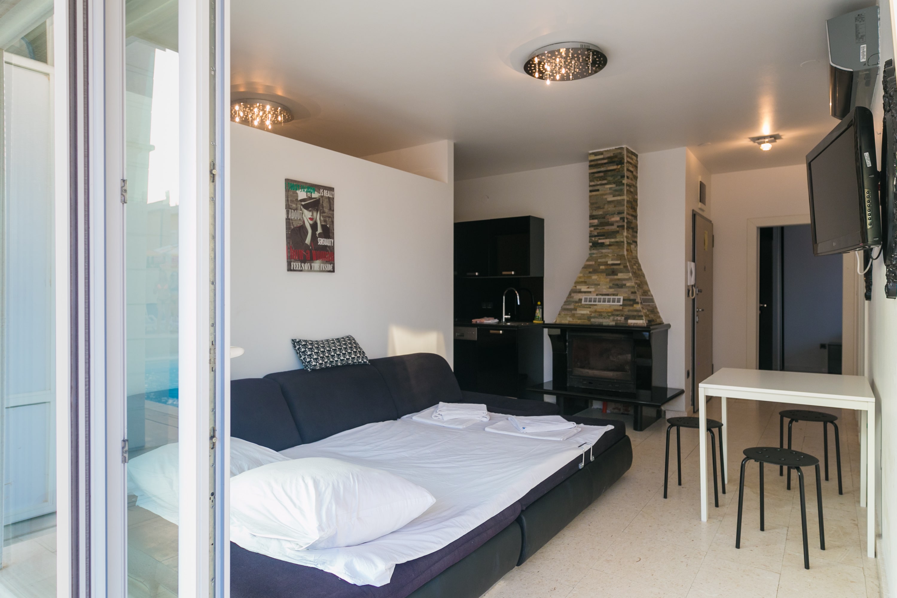 Apartment has 4 rooms (3 bedrooms + a big living room connected with a kitchen). Rooms feature french beds, each for 2 persons and with an extra bed. Living room extendable couch can also serve as a bed for 2 persons.